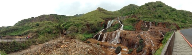 Golden Waterfall didn’t look very golden… but it was still pretty 🙂 Well, the rocks at the bottom of the waterfall looked more golden 😛 Being there early, there weren’t many people, so we could take our time to enjoy the view. From the viewing platform nearby, we could also see the 水湳洞陰陽海 (Yin Yang Sea). We could hardly make out the slight yellowish-brown part in the blue blue sea, but probably because it was really cloudy that morning.