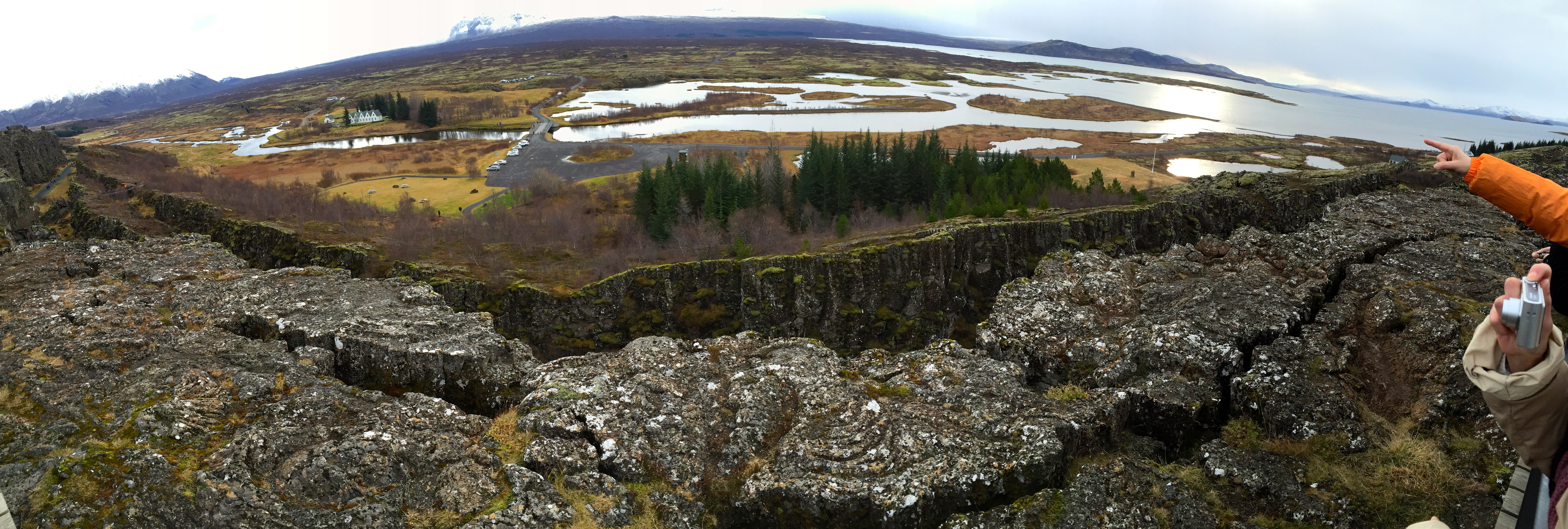 First stop on our bus tour was Þingvellir National Park which is a site of historical, cultural, and geological importance. This site is where the world’s oldest parliament started in the year 930, and its remains can still be seen today. It is the site of a rift valley that marks the crest of the Mid-Atlantic Ridge that separates the North American plate from the Eurasian Plate. One can literally walk between 2 continents here!
