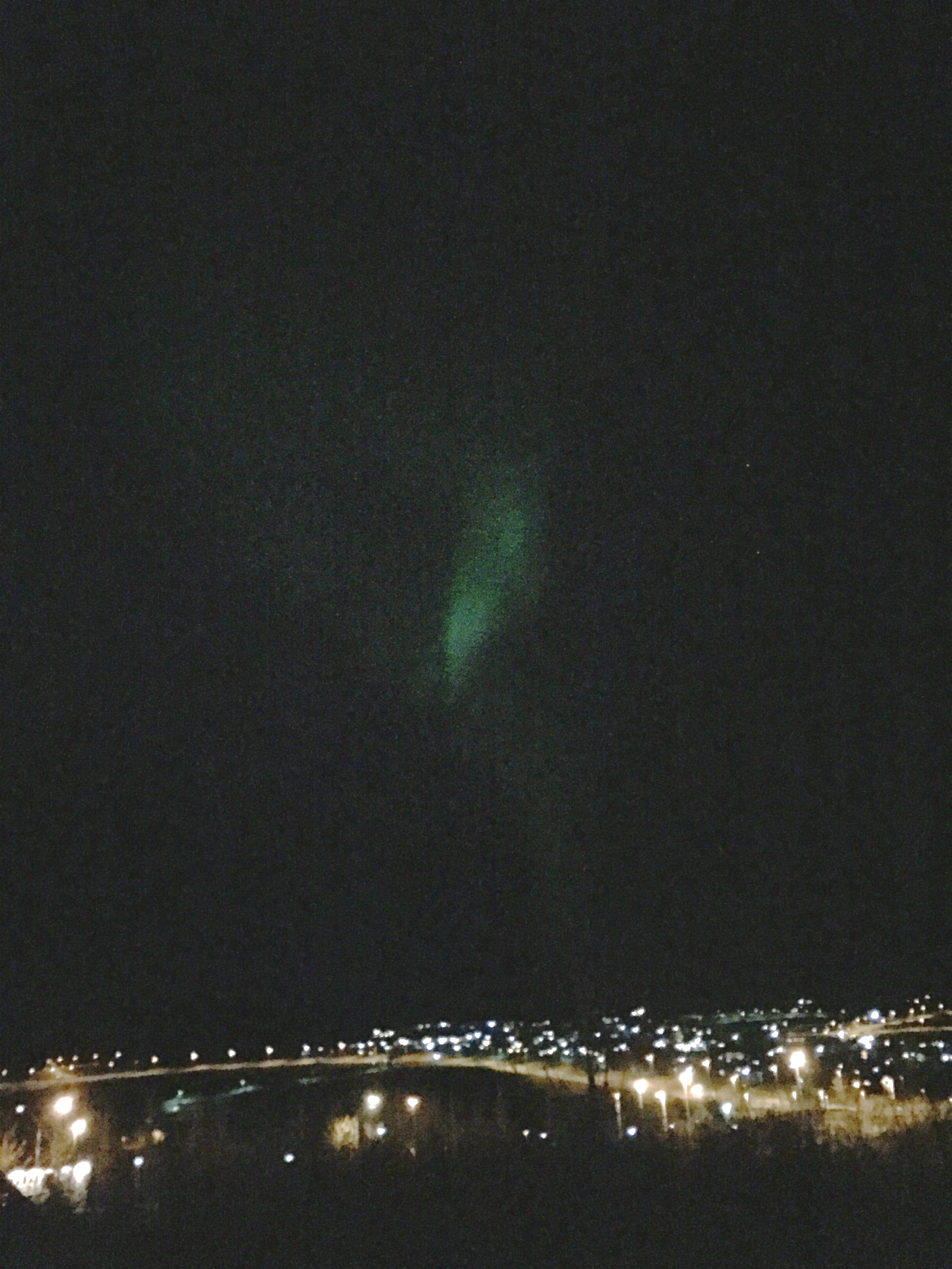 We reached back our hotel just past midnight, feeling quite tired and disappointed. The sky was so clear tonight! Boiled some water for hubby to make coffee and have some supper. I decided to open up the balcony window for some ventilation, and as I turned back, something made me turn right back. I wasn’t sure if I was seeing what I was seeing and shouted for hubby to come quickly!! The northern lights were appearing right there!!! In green!!!! Oh my!!! It lasted around 5 minutes and I decided that we simply had to get out of our room to the other side of the hotel as I thought I could still see light. Despite being cold and hungry and tired and just removed his socks and outer layers, hubby decided to indulged to my whims… We went down and circled our hotel, and concluded that the lights might have been from that yuko ono / John Lennon memorial light, or simply just the street and building lights…