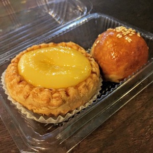 While trying to decide what to buy home, we figured that we should try out the patries first, since there were seats available. We got ourselves the 2 most popular items, the Rickshaw Egg Tart 三轮车蛋挞 (RM2/pc), and the Salted Egg Yolk Pastry 咸蛋酥 (RM1.90/pc). We plonked ourselves at a table with the air-conditioning blowing at us 😀