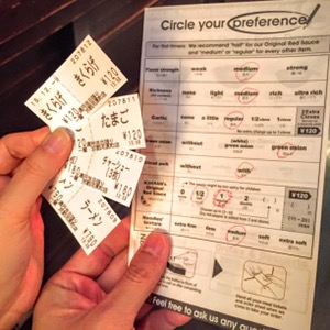 The 一蘭 Ichiran experience starts from ordering your noodle and extra ingredients using a vending machine (or coupon machine). Then you wait in line for the server to assign you a cubicle. Yes you need to dine in a cubicle ALONE. Haha…